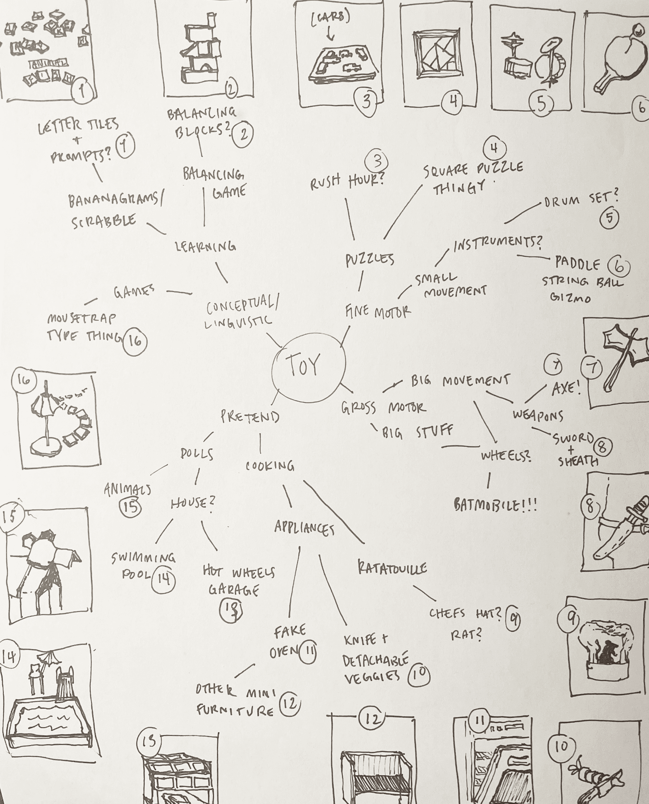 I started by simply creating a mind map of different potential products/designs that applied to a wide variety of companies using cardboard packaging.